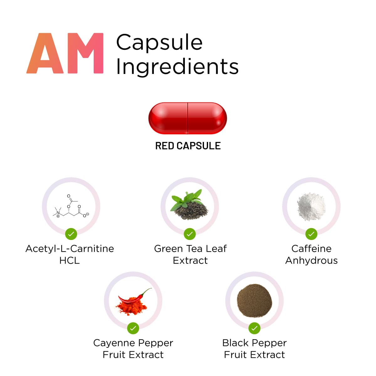 The AM capsule's thermogenic ingredients boost your metabolism, allowing you to burn more calories and fat throughout the day.