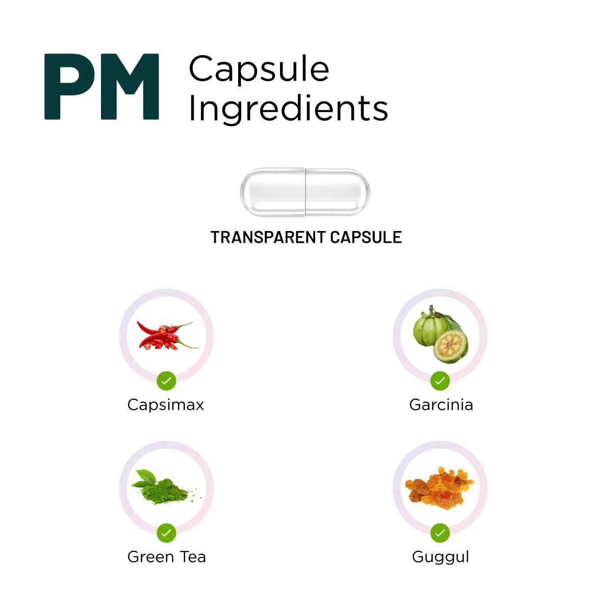 The PM capsule helps curb cravings and promotes a feeling of fullness, assisting you in managing portion sizes and late-night snacking.